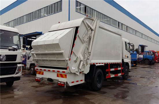 后装压缩挂桶垃圾箱: 垃圾箱体边采用3mm碳钢板,底板采用4mm碳钢板,箱体容积4.0-5.0(标准容积)方米,箱体打骨架加强,后推板式垃圾箱(选择安装挂桶翻转机构或垃圾斗翻转机构);