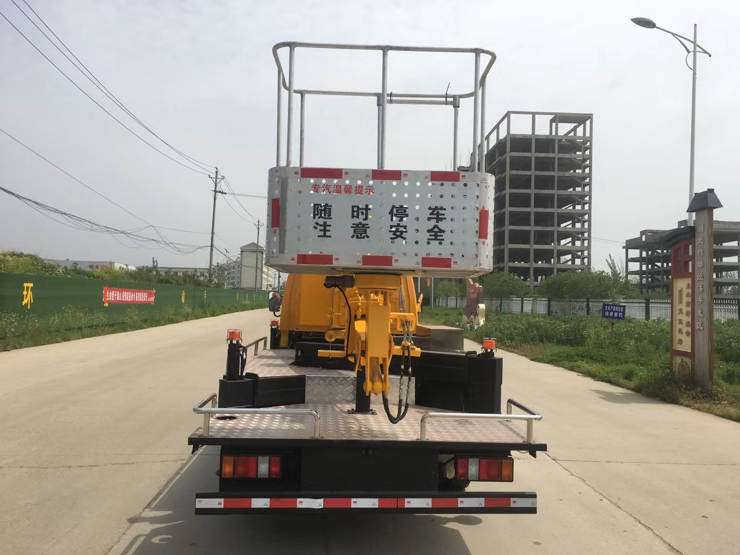 随底盘选装驾驶室;该车后伸300mm;侧防护材料Q235B,螺栓连接;后防护材料Q235,焊接连接,后防护截面高度尺寸120mm,截面宽度尺寸30mm,下边缘离地高度380mm;ABS系统型号:APG3550500A,ABS系统生产厂家:浙江亚太机电股份有限公司;该车主要用于抢修电力,通讯,路灯等高空作业,专用装置为升降平台和作业臂.