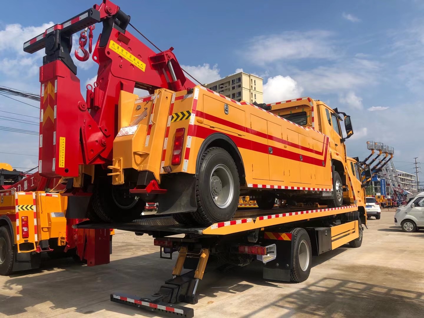 重汽豪沃10吨板一拖二清障车,性价比超高的10吨板,豪沃NX宽体排半驾驶室(带卧铺)、四点悬浮、5600轴距,潍柴220马力发动机(发动机型号:WP4.6NQ220E61,排量:4580ml,功率:162kw),豪沃8档带原装取力器变速箱,曼13吨级后桥,10.00R20钢丝胎、双层车架(8+5/280)另外包一层;多片簧;断气刹、ABS;气囊座椅、自动空调,高位保险杠(金属);300L铝合金油箱;拉索式PTO;重汽智能通D版,其余标配。