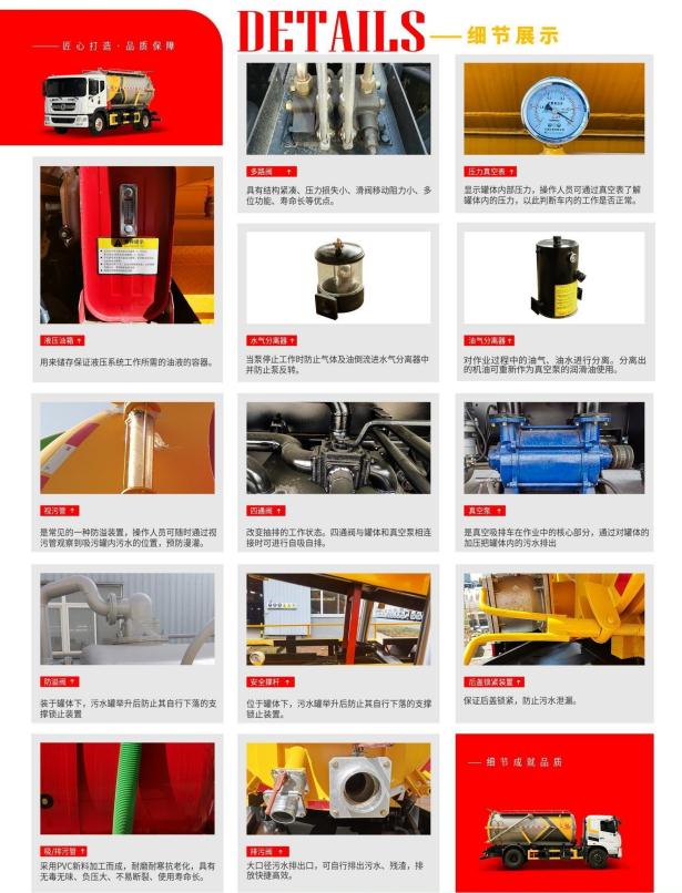 外观尺寸按照公告制作,罐体外形尺寸(直段长×直 径)(mm):4200×1700,罐体有效容积10.5m³,罐体材质为武钢优质碳钢,罐体厚度为6mm,蝶形封头,罐体后门液压开启, 机械锁紧,罐体举升自卸,罐体右侧上方一个视污管,后封头下方一个150球阀,配备10吨真空泵/SK-15水循环泵,水油分离器,防溢阀,边灯带电,1根8米的吸污管,其余标配。 |