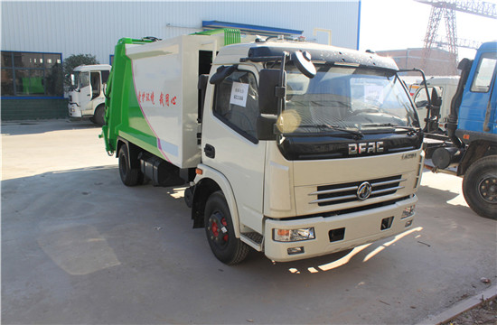 东风多利卡6吨压缩式垃圾车上装配置:有效压缩容积7-8立方,可装7吨生活垃圾,压缩倍率3-4倍,压缩后生活垃圾密度从0.36变为0.9以上,带污水收集箱,新款平板式箱体更美观,尾部带 密封橡胶垫,可防污水滴漏二次污染。尾部可带翻转斗或挂桶装置,可选装PLC一键操控系统,驾驶室和尾部双操控机构。