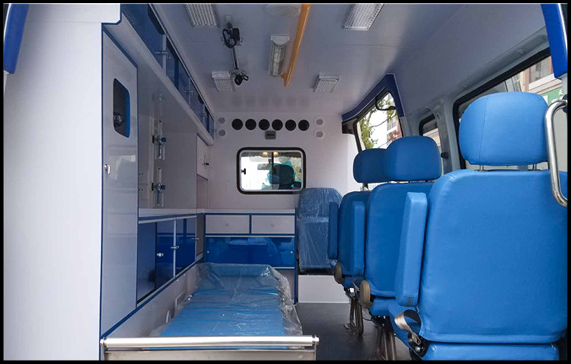 该车配备医疗器械柜,担架,氧气瓶,消毒灯等救护专用设备.选装车顶、双侧移门、推拉侧车窗、钢轮圈、侧爆闪灯、后爆闪灯、换气扇、侧踏步、后踏步、前格栅、尾标,不选装后踏步车长5700mm.选装后踏步车长5910mm,一体式后踏步整车长度5785mm,装中顶车高2540mm.选装高顶车高2747mm,中顶选装异型顶车高为2480mm.高顶选装异型顶车高2630mm.该车型可以不装前雾灯,不装高位制动灯.ABS生产厂:博世汽车部件(苏州)有限公司,博世汽车部件(苏州)有限公司,ABS型号:ABS 9,ESP9.发动机最大净功率: